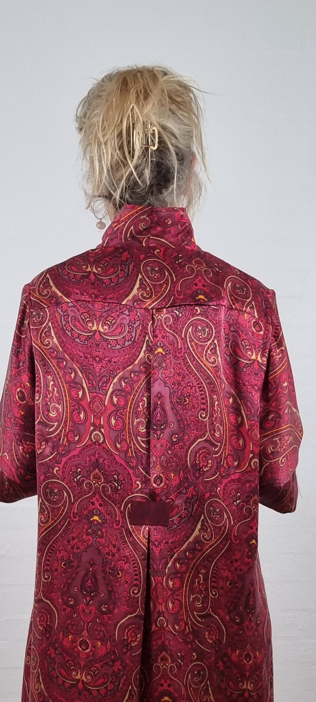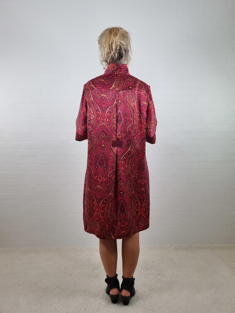 Silken er noget helt særligt. Den røde bundfarve er levende og dyb, og stoffet er dekoreret med et sjalsinspireret mønster i sort og en fin accent af limegul. Mønstret skaber liv og karakter uden at dominere – det gør kjolen sofistikeret og kunstnerisk på samme tid.