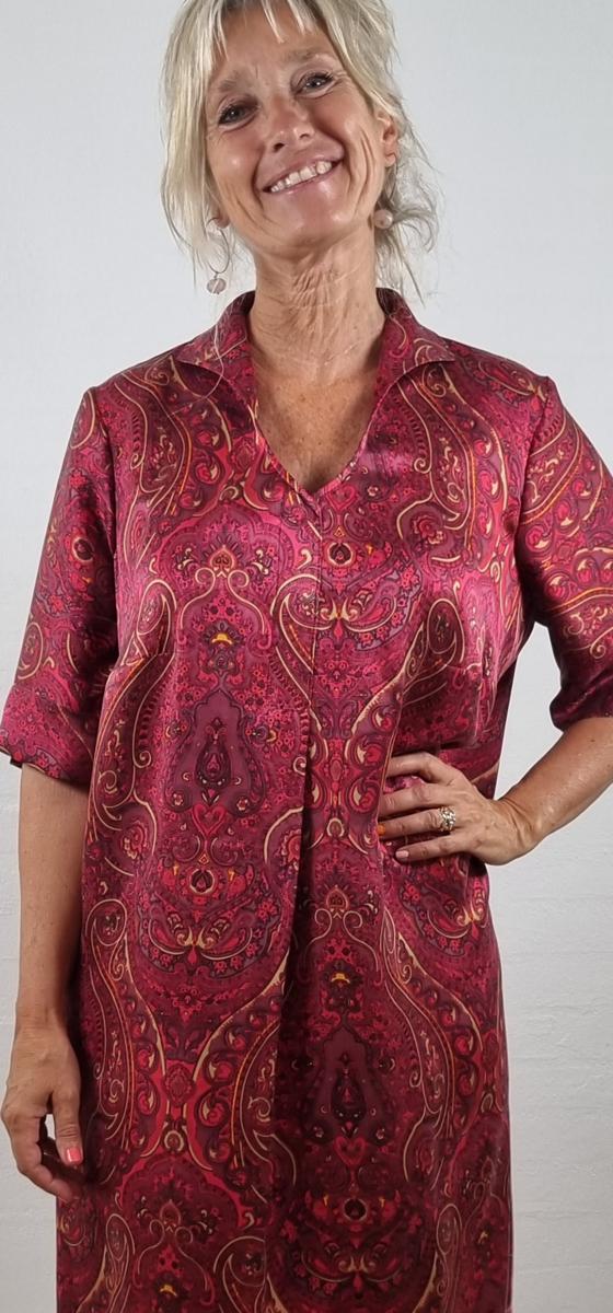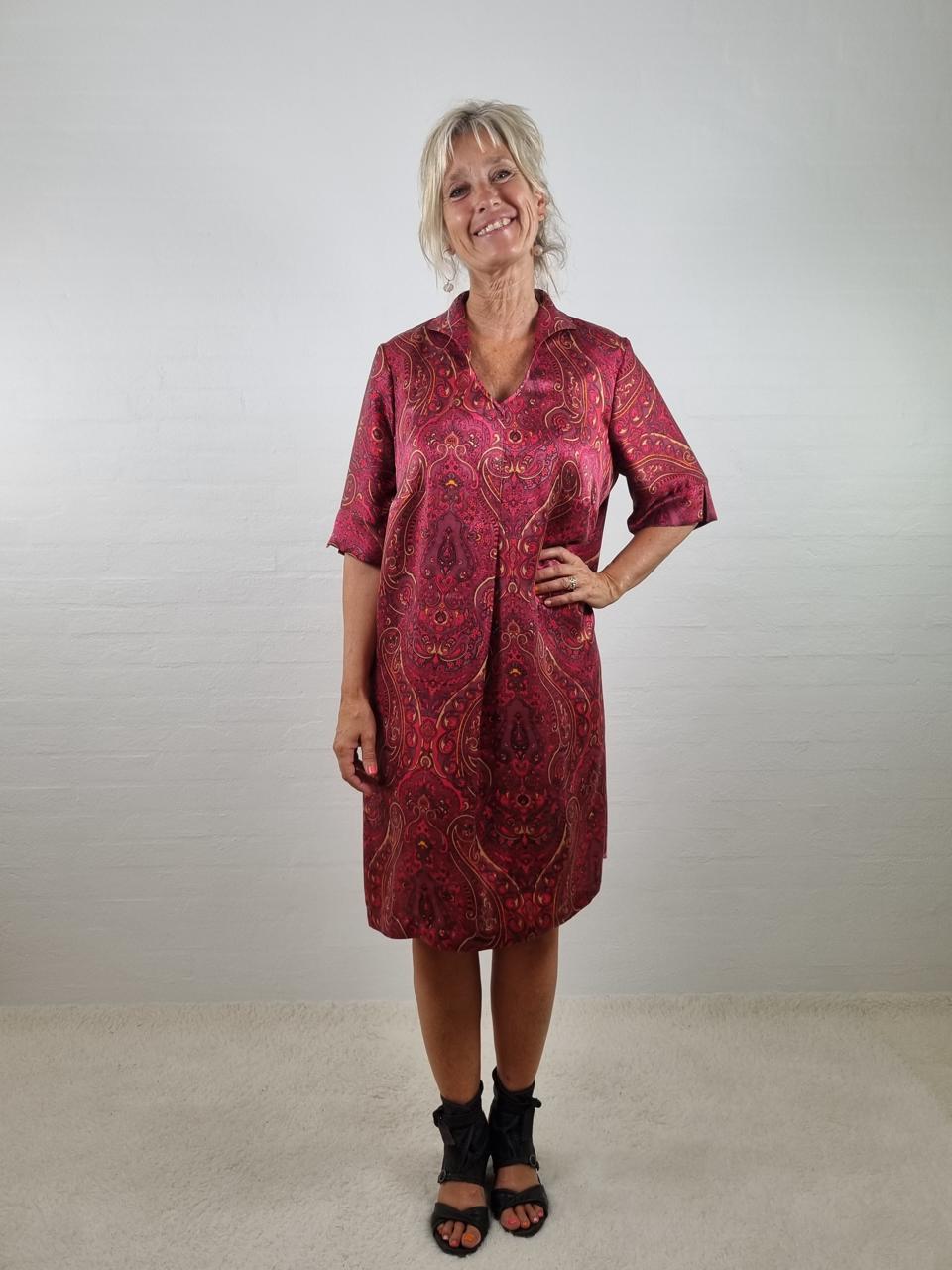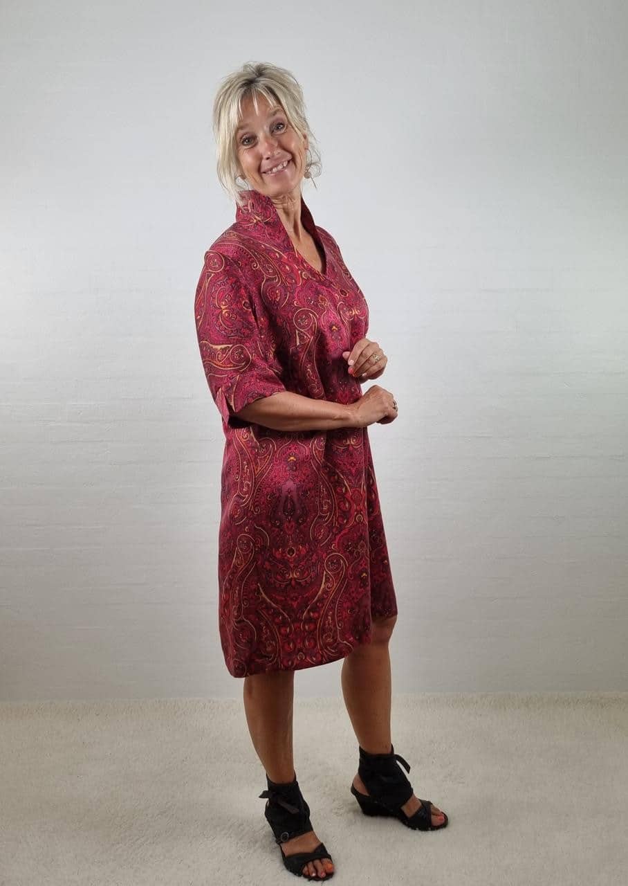 Rød silkekjole med krave – sofistikeret elegance med et kunstnerisk touch