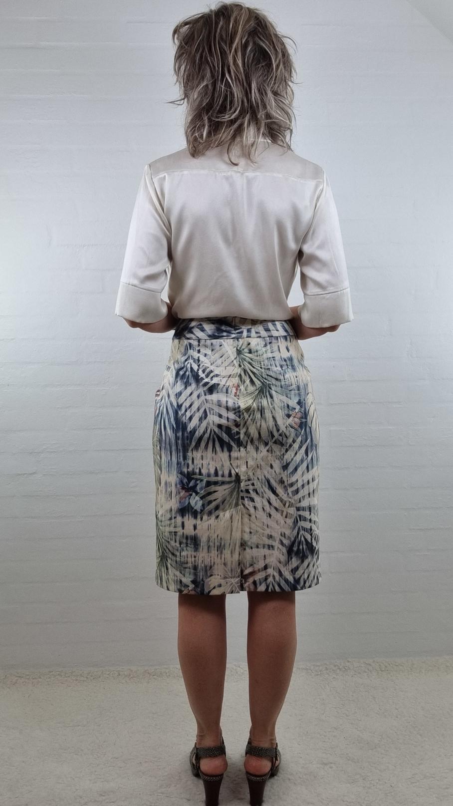 Stretch nederdel i blå råhvid og nude – håndsyet pasform og linning der ikke strammer