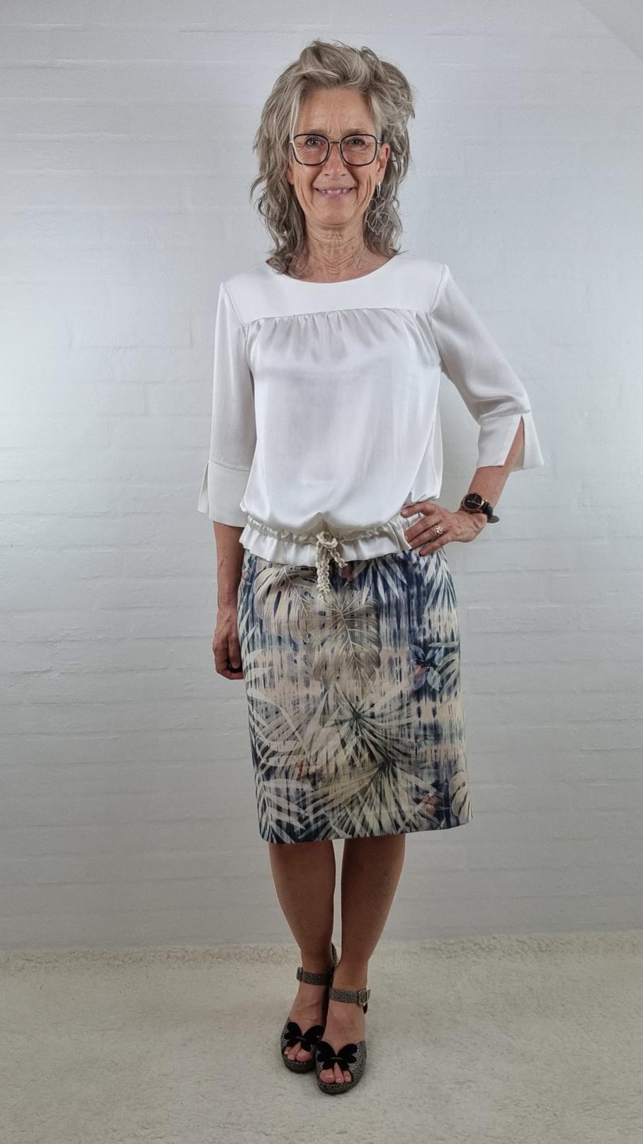 Stretch nederdel i blå råhvid og nude – komfort og bevægelse i ét design